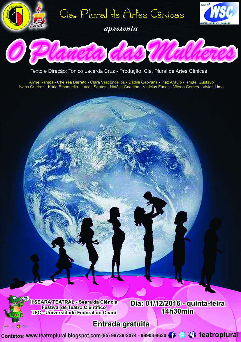 Sendo assim, o espetáculo O PLANETA DAS MULHERES (encenado por alunos participantes do projeto na EEFM WALTER DE SÁ CAVALCANTE) foi selecionado (após inscrição) para participar da II SEARA TEATRAL - Festival de Teatro Científico da Seara da Ciência, da UFC - Universidade Federal do Ceará. A apresentação será no dia 01/12/2016, às 14h30min, no teatro da Seara da Ciência, que fica na entrada do campus do Pici, da Universidade Federal do Ceará.