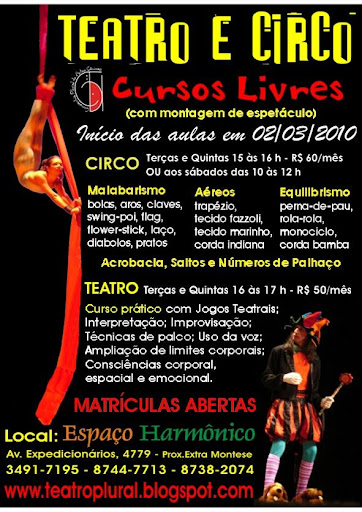 Para saber horários, turmas e outras informações, CLIQUE AQUI para ir ao link da ESCOLA PLURAL DE TEATRO E DE CIRCO.